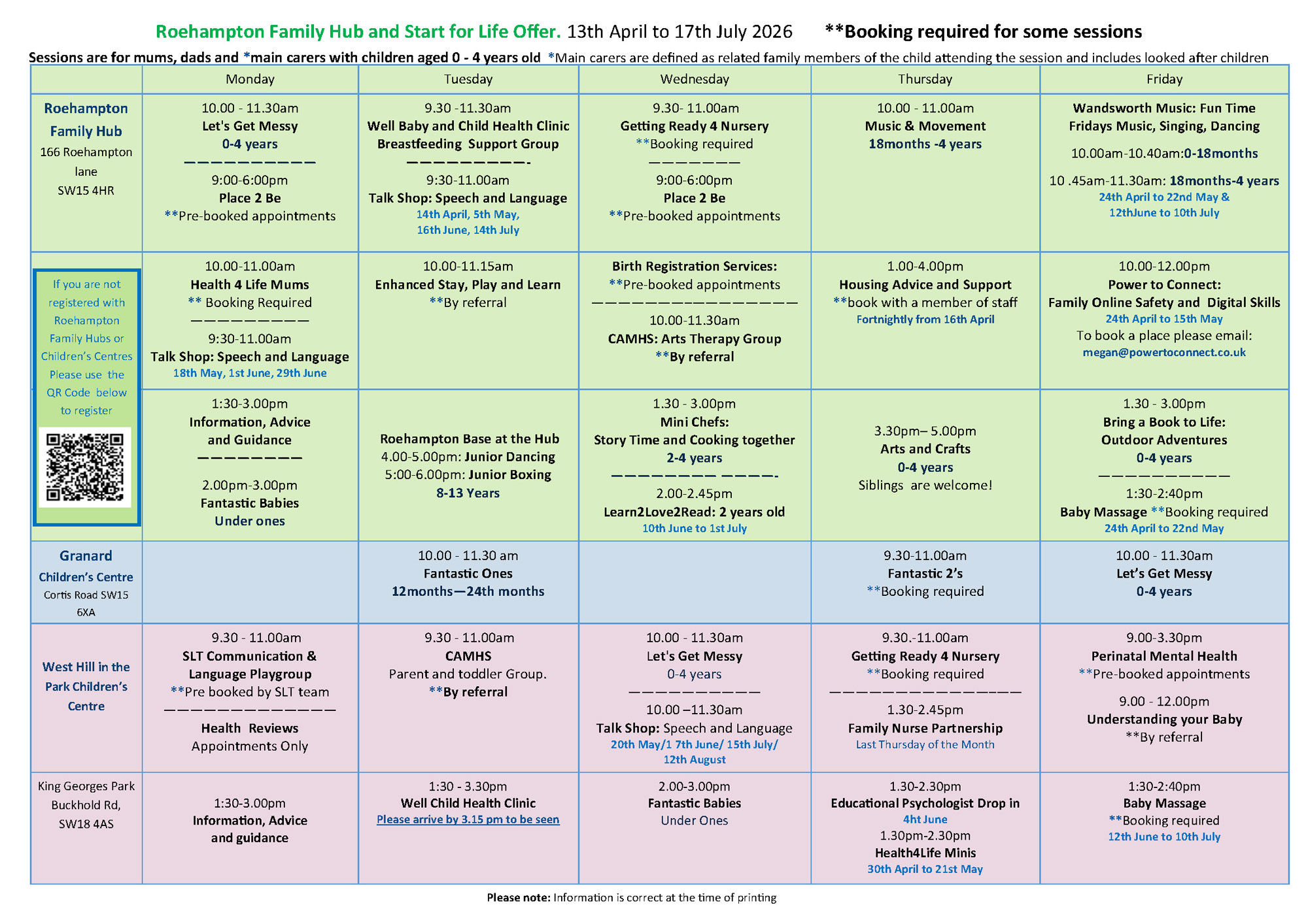 We have recently published the Roehampton Family Hub timetable and the Start for Life Offer from 13th April to 17th July 2026. The timetable provides details about the upcoming sessions and activities available to families during these months. Please note that booking is required for some of the sessions, so you are encouraged to review the timetable carefully and reserve your place as needed.